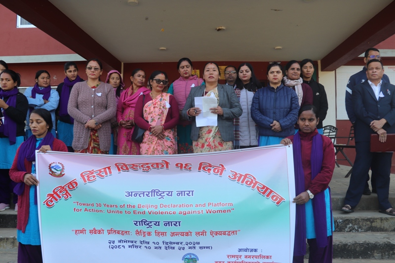 “हामी सबैको प्रतिबद्धता लैङ्गिक हिंसा अन्त्यको लागि ऐक्यबद्धता” भन्ने अन्तर्राष्ट्रिय नाराकासहित रामपुर नगरपालिकाले अभियान सोमबार देखि शुरु गरेको छ ।