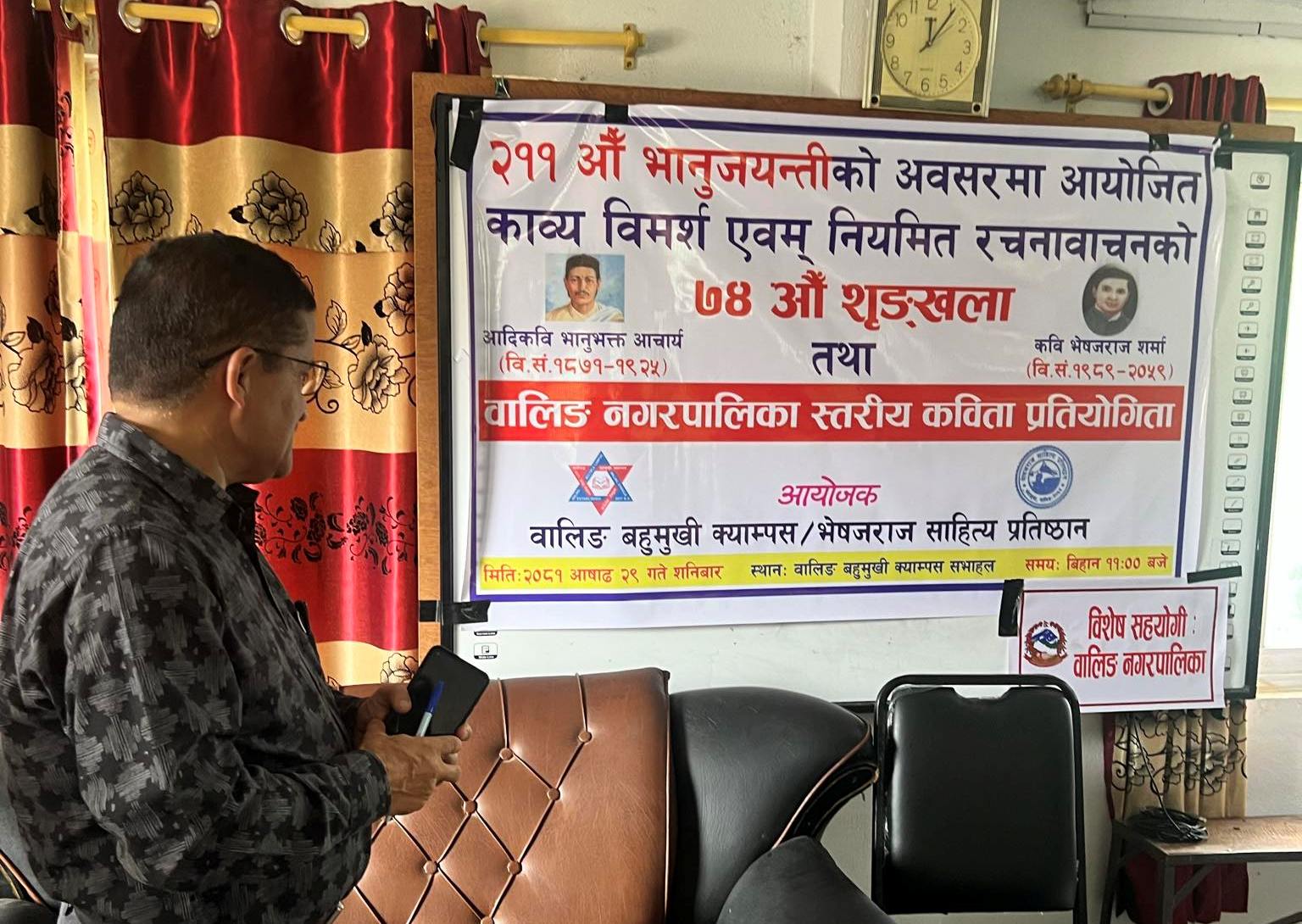 भानुजयन्ती एवम् भेषजराज साहित्य प्रतिष्ठानको नियमित रचना वाचनको ७४औँ शृङ्खलाको अवसरमा शनिबार वालिङ बहुमुखी क्याम्पस र भेषजराज साहित्य प्रतिष्ठानको संयुक्त आयोजनामा वालिङ नगरपालिकास्तरीय खुल्ला कविता प्रतियोगिता २०८१ को आयोजना गरिएको